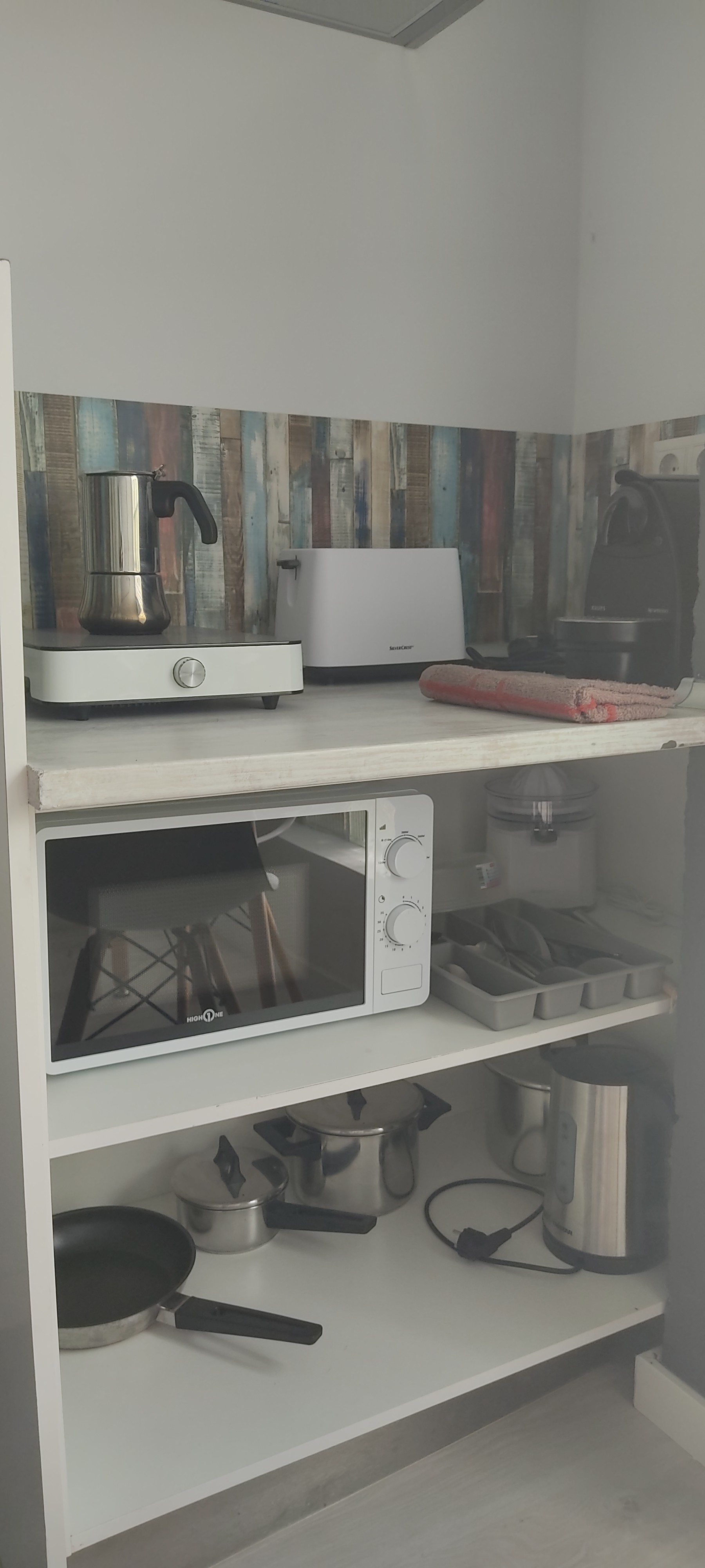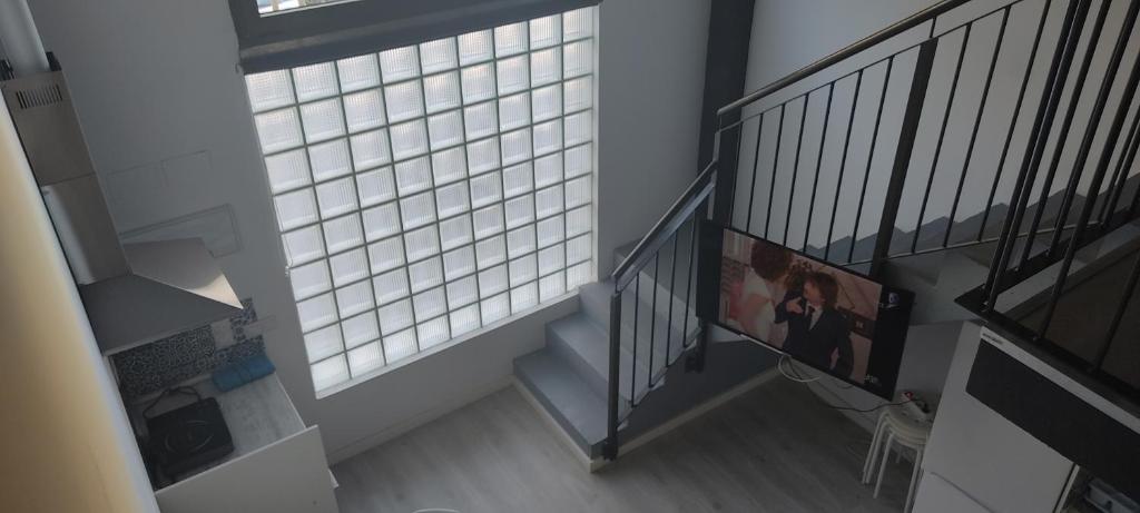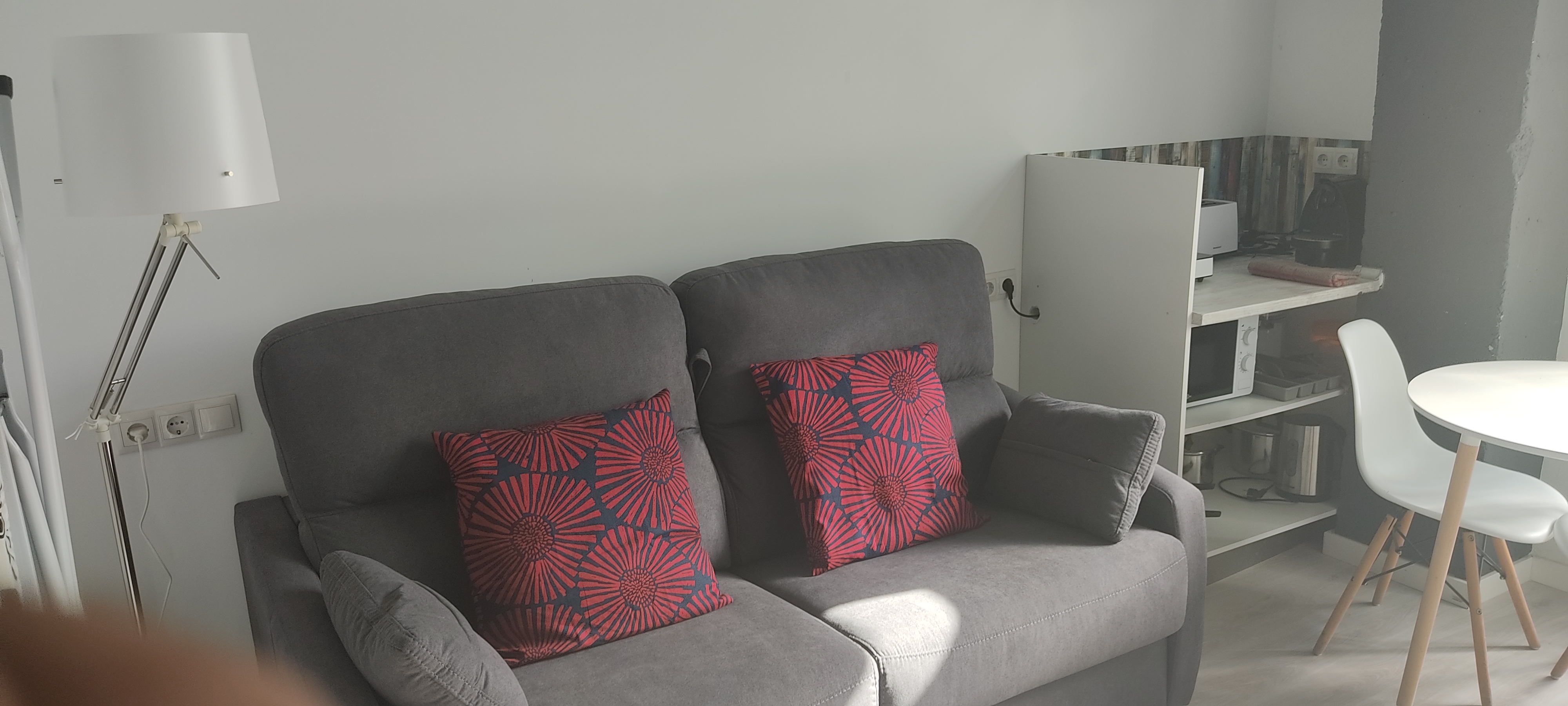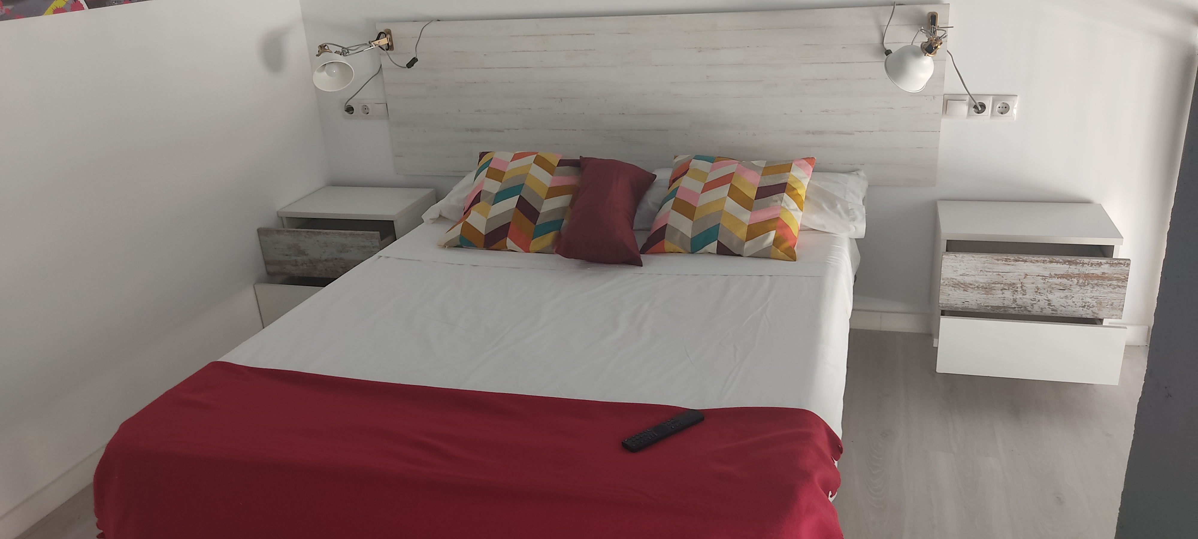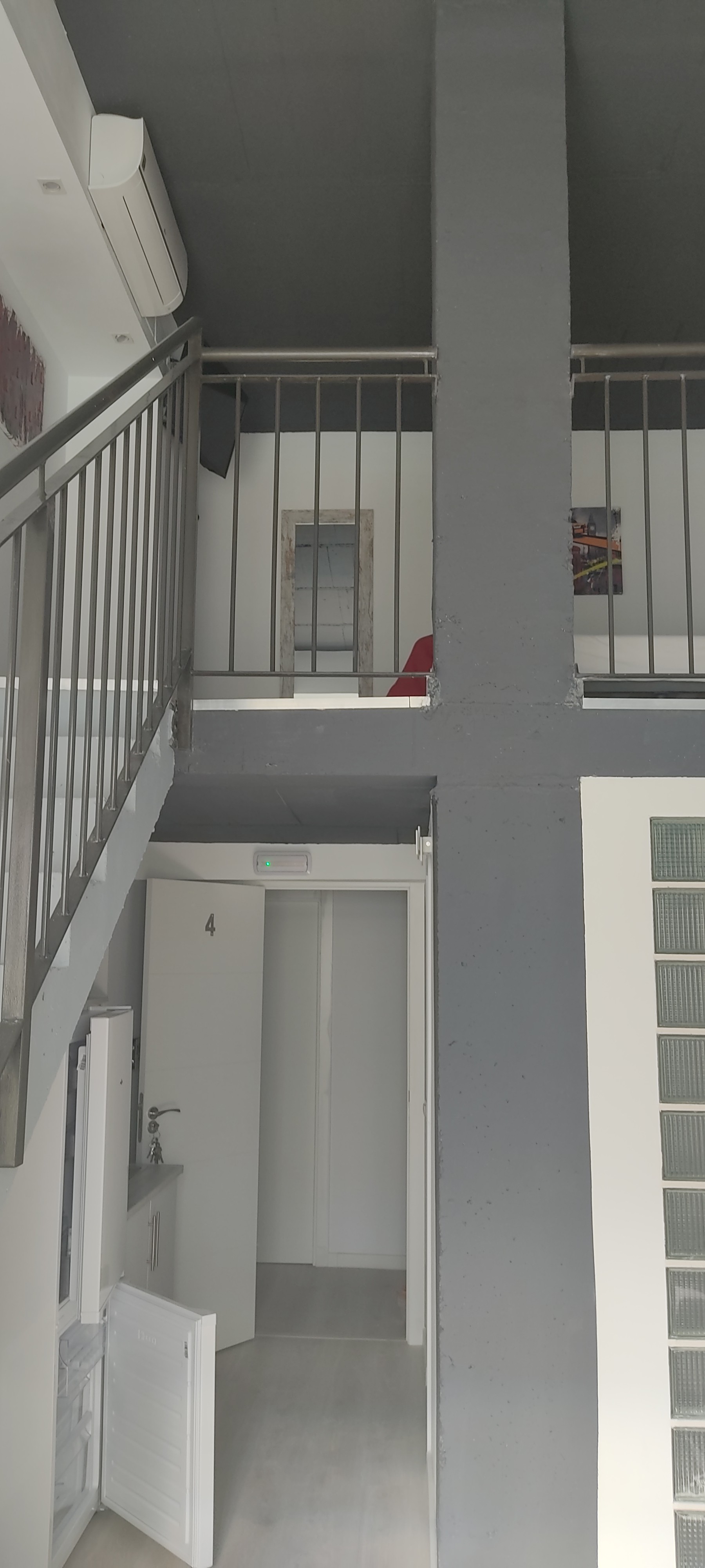 El estudio cuenta con 1 dormitorio con TV SMART TV en planta superior y en la planta inferior, baño con ducha, mueble con placa induccion, nevera grande, microondas y un segundo mueble con fregadera.
