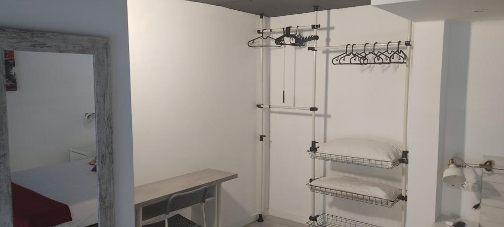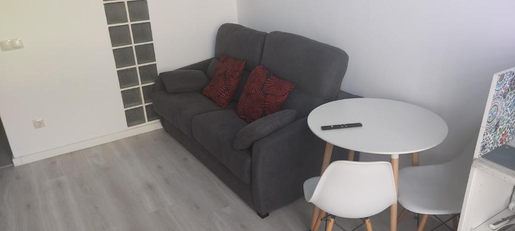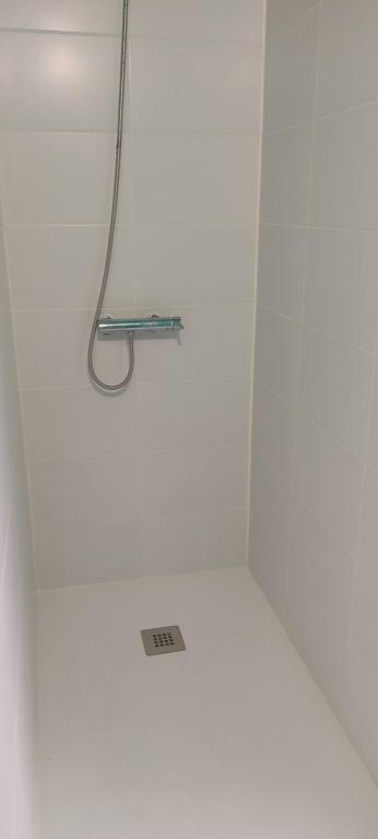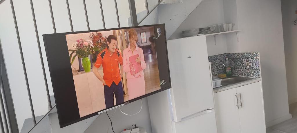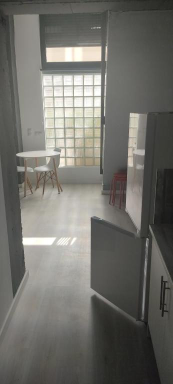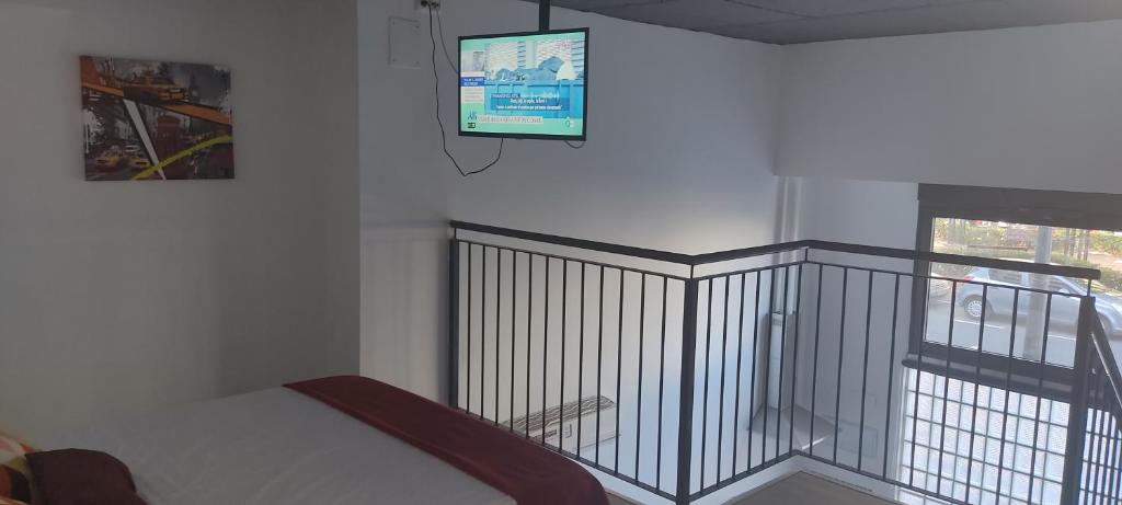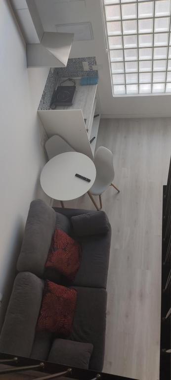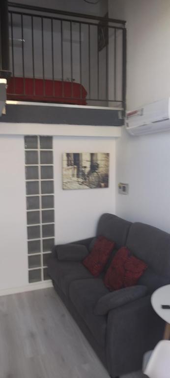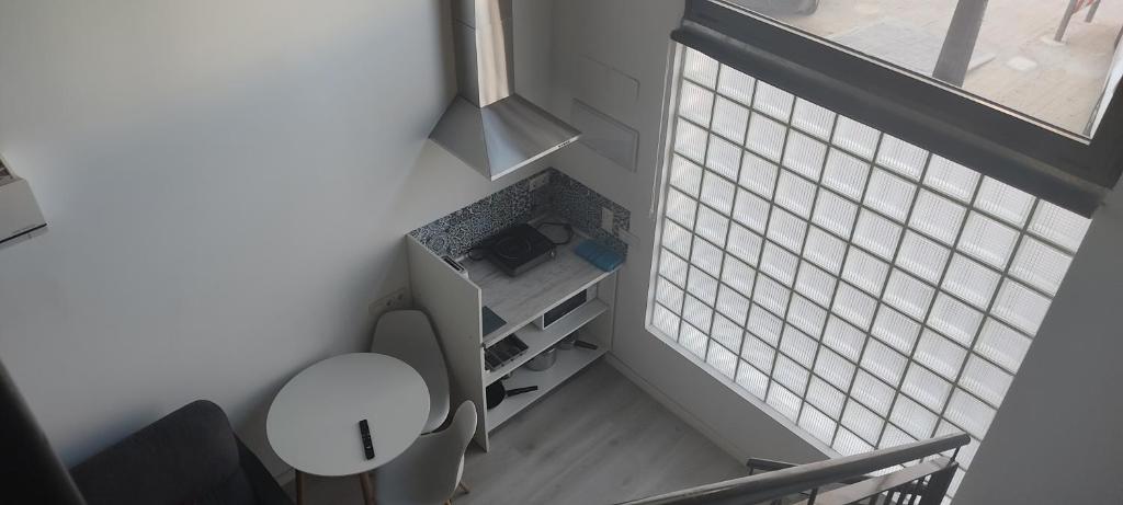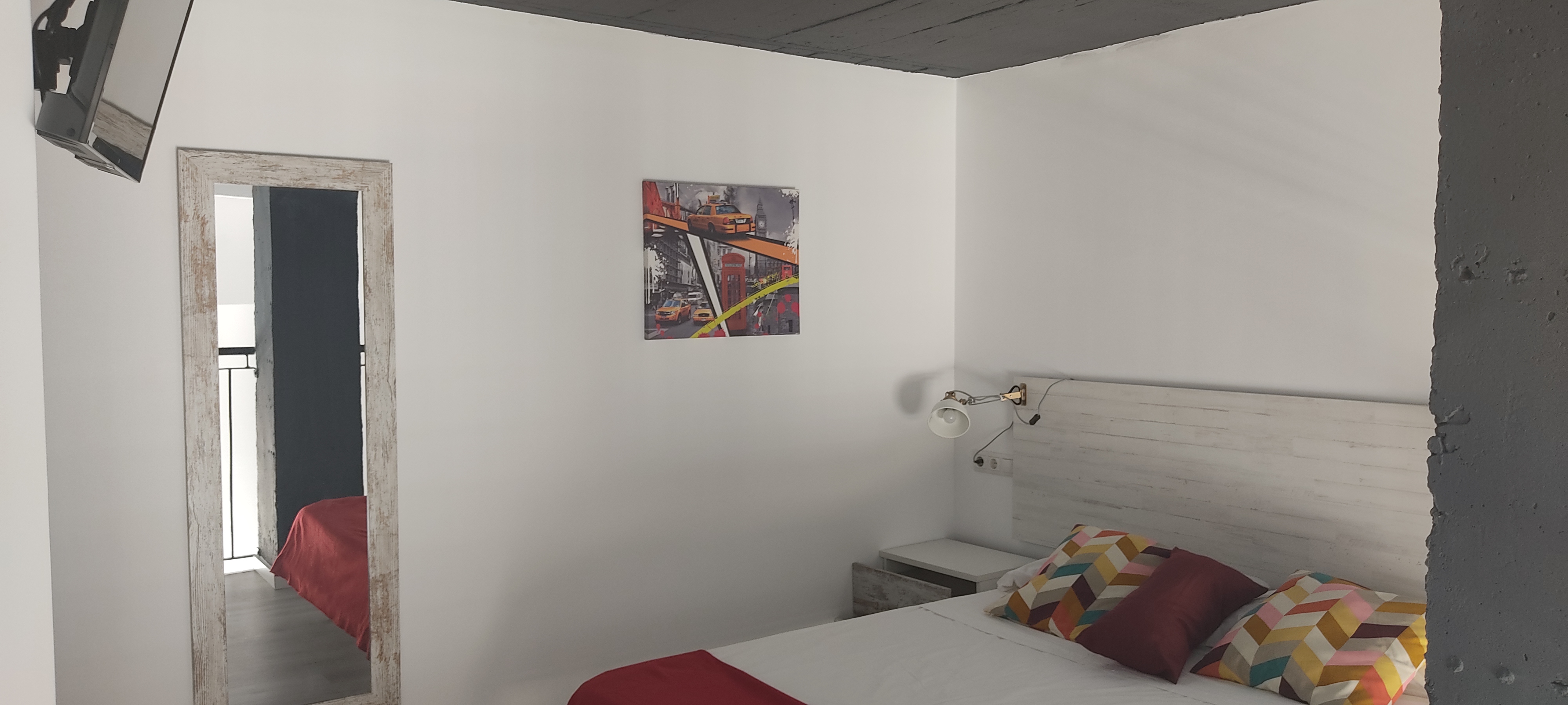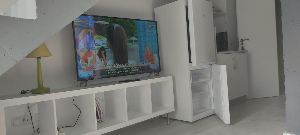 El estudio cuenta con 1 dormitorio con TV SMART TV en planta superior y en la planta inferior, baño con ducha, mueble con placa induccion, nevera grande, microondas y un segundo mueble con fregadera.