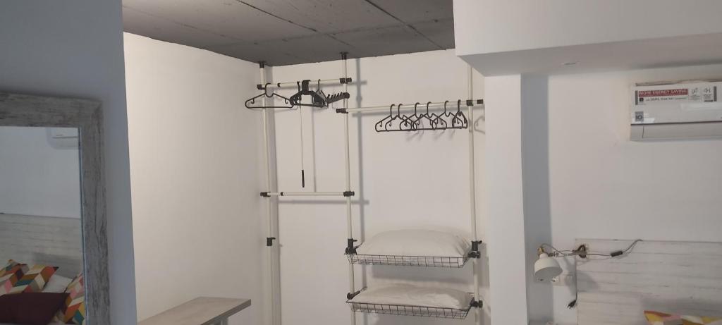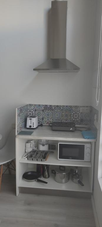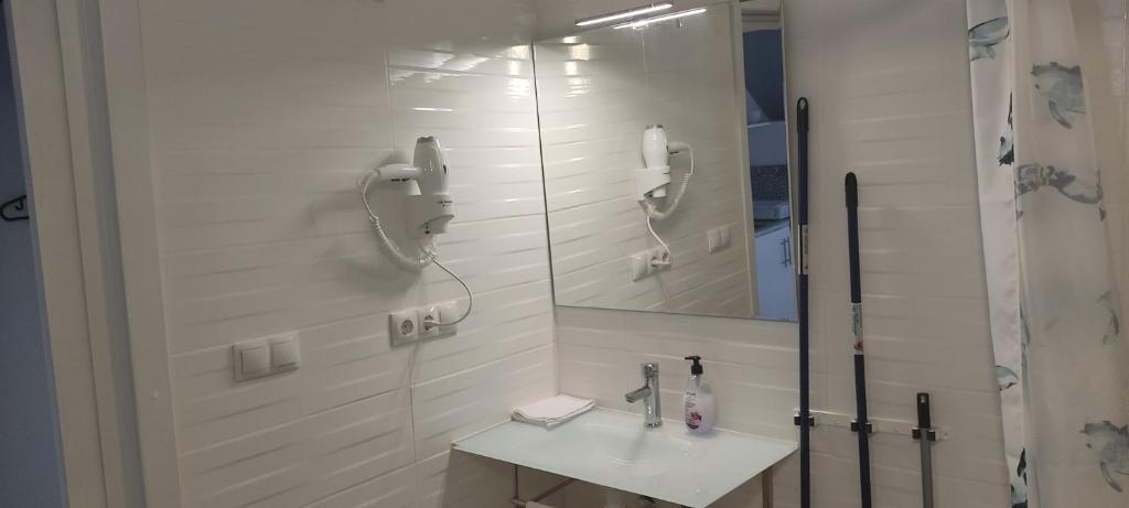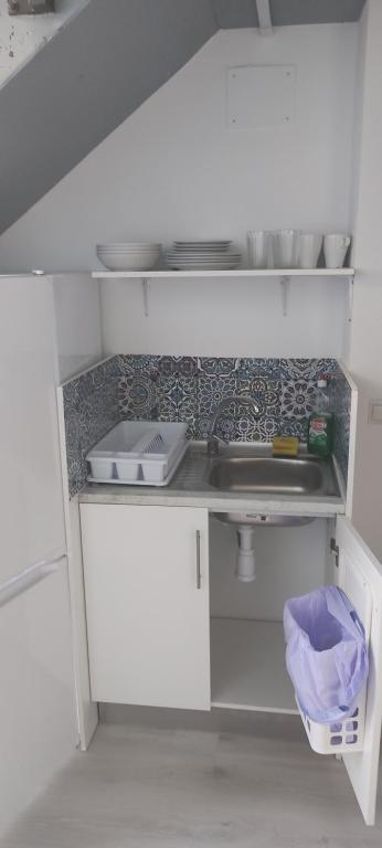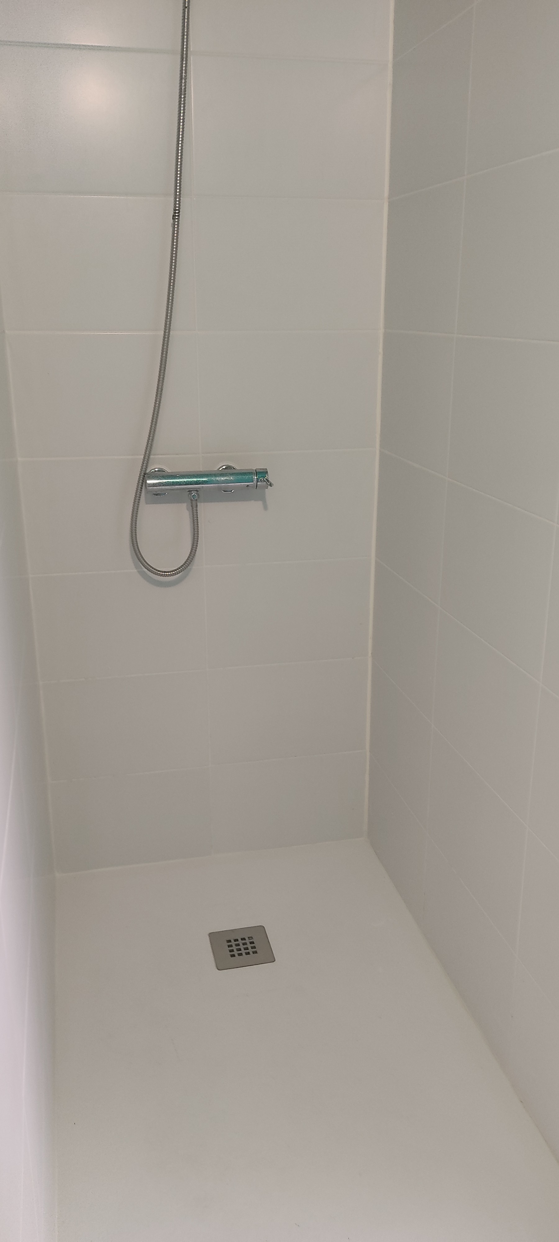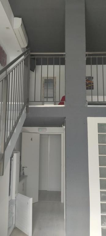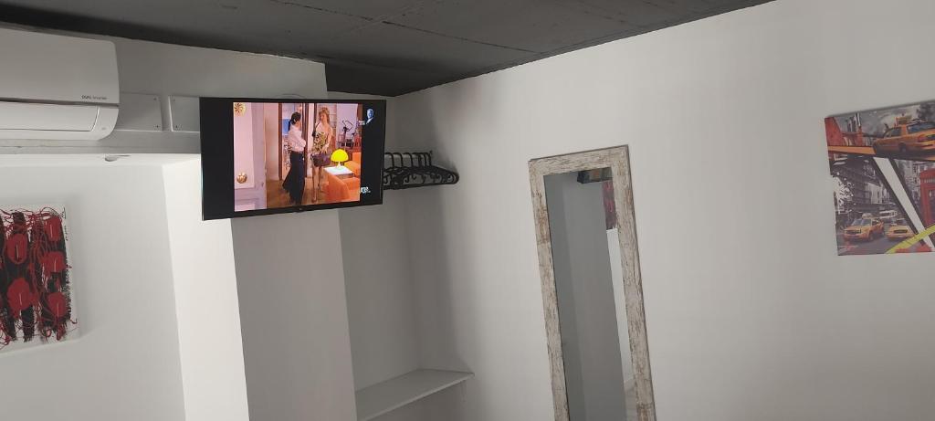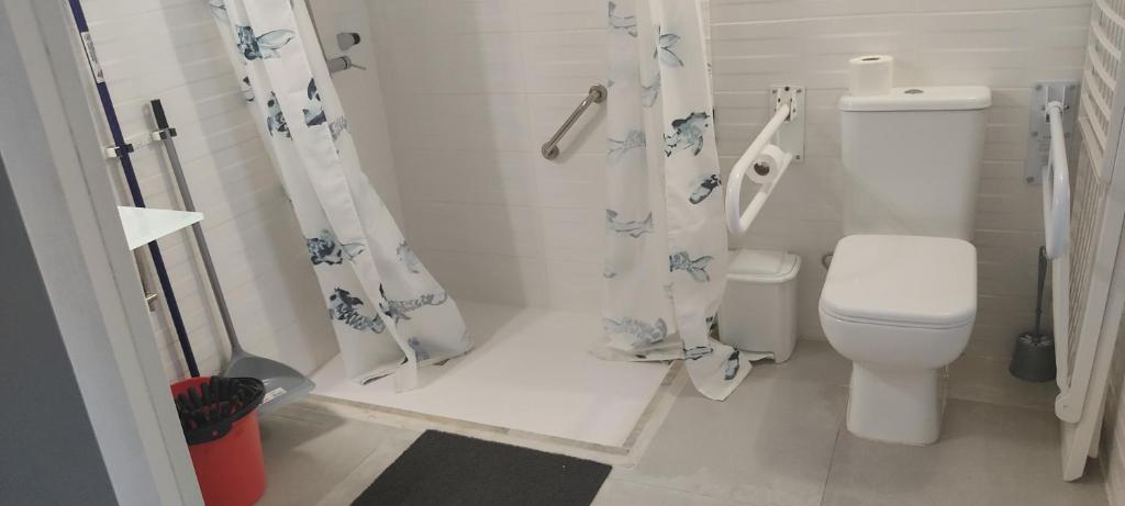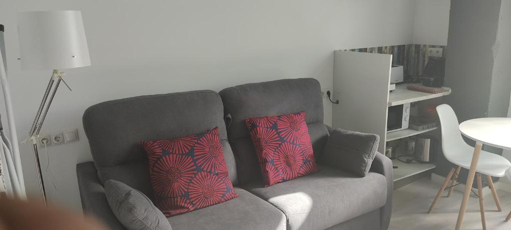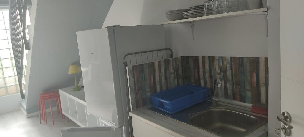 El estudio cuenta con 1 dormitorio con TV SMART TV en planta superior y en la planta inferior, baño con ducha, mueble con placa induccion, nevera grande, microondas y un segundo mueble con fregadera.